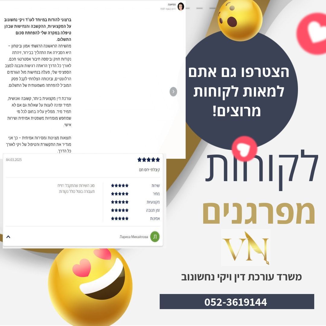 משרד עורכי דין ויקי נחשונוב ושות' מתמחה בדיני משפחה ומספק ללקוחותיו ליווי מקצועי, רגיש ואישי לאורך כל שלבי הליך הגירושין. אנו שמים דגש על שמירה קפדנית על האינטרסים של לקוחותינו, תוך התמקדות בהגנה על רווחת הילדים והנכסים הפיננסיים, ותוך הקפדה על גישה אנושית ומכבדת.